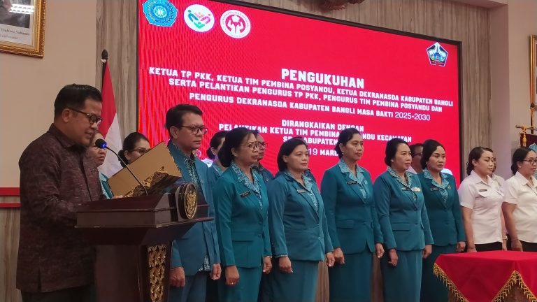 BANGLI, FORUMKEADILANBali.com – Bupati Bangli Sang Nyoman Sedana Arta mengukuhkan serta melantik kepengurusan Tim Penggerak PKK, Ketua Dekranasda dan Ketua Posyandu Kabupaten Bangli dirangkaikan pelantikan Ketua Tim Pembina Posyandu Kecamatan se-Kabupaten Bangli masa bakti 2025-2030, di Gedung Bhukti Mukti Bhakti Kantor Bupati Bangli, Rabu (19/3/2025).