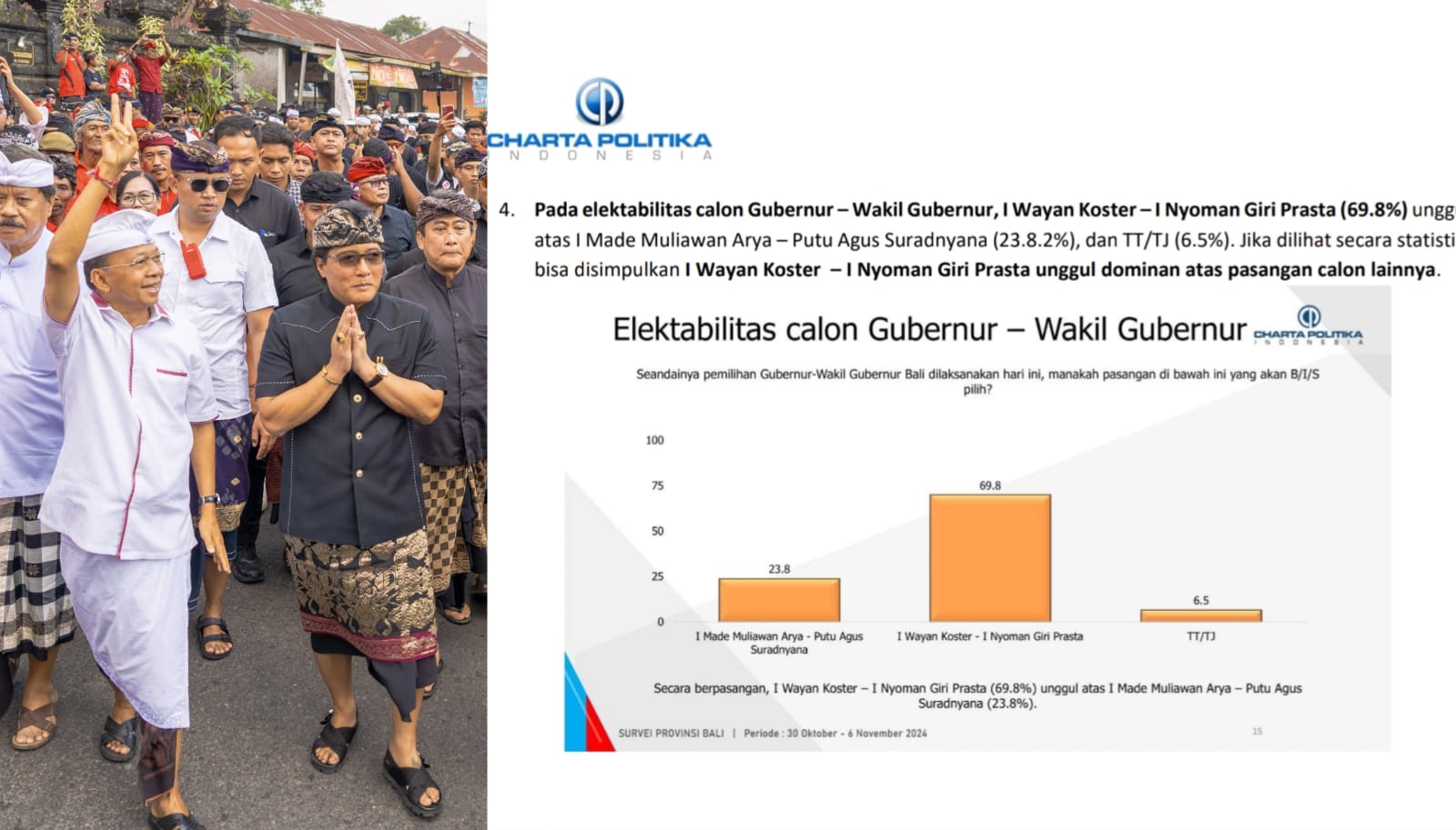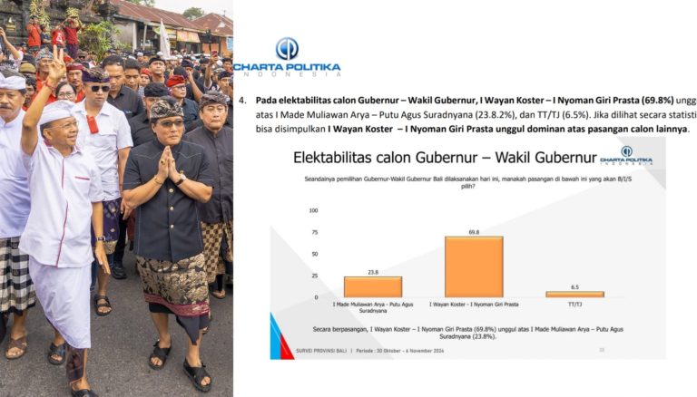 FORUMKEADILANBali.com – Menjelang pencoblosan Pilkada serentak pada 27 November 2024, lembaga survei resmi terdaftar di KPU Charta Politika Indonesia mengeluarkan survei terbaru Paslon Gubernur Bali nomor 2 Wayan Koster dan Giri Prasta (Koster-Giri) dan Made Muliawan Arya-Putu Agus Suradnyana (Mulia-PAS).