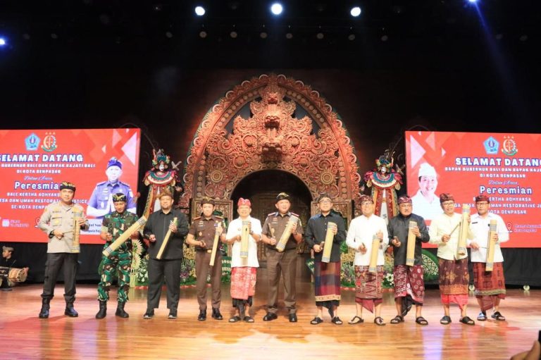 DENPASAR, FORUMKEADILANBali.com – Gubernur Bali Wayan Koster bersama Kajati Bali Ketut Sumadana, Walikota Denpasar IGN Jaya Negara, Wakil Walikota Kadek Agus Arya Wibawa dan Ketua DPRD I Gusti Ngurah Gede meresmikan serentak Bale Kertha Adhyaksa Jaga Desa dan Umah Restorative Justice seretak 27 desa, 16 kelurahan dan 35 desa adat di Kota Denpasar dengan menyuarakan kulkul di Gedung Dharma Negara Alaya, Denpasar, Jumat (13/6/2025).