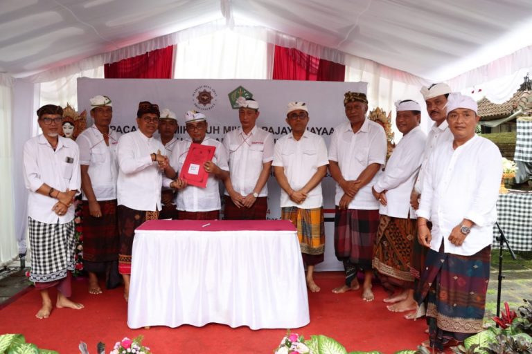 Serah terima jabatan dari Bendesa Adat sebelumnya I Gusti Ngurah Gede Punia kepada I Gusti Ngurah Gede Marhaendra Jaya telah dikukuhkan.