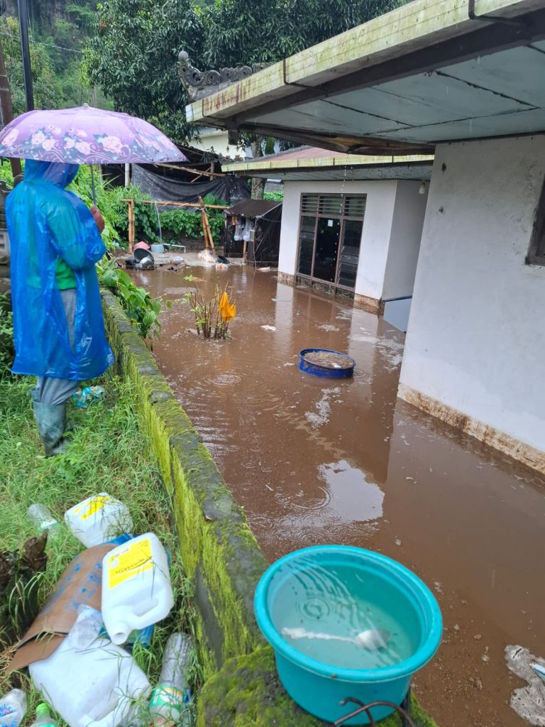 Banjir terjadi di ruas jalan Songan menuju Pura Hulun Danu Songan. Air hujan bercampur lumpur menggenangi ruas jalan, menyebabkan kendaraan roda dua dan mobil terjebak lumpur, dan tidak dapat menerobos luapan banjir.