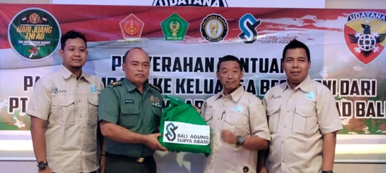 FORUM Keadilan Bali – Peringatan Hari Juang Kartika TNI AD ke-78 Tahun 2023, mengambil tema ”Tentara Nasional Indonesia Angkatan Darat Maju Bersama Rakyat.’’ Memaknai peringatan tersebut, Dewan Pimpinan Daerah (DPD) Himpunan Putra Putri Keluarga Besar TNI AD (Hipakad) Bali, bersama PT Bali Agung Surya Abadi melaksanakan bakti sosial berupa penyerahan bantuan paket sembako di Makodam IX/Udayana, Kamis (14/12/2023).