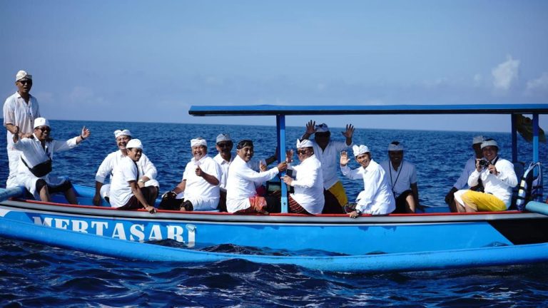 Sekretaris Daerah (Sekda) Kota Denpasar Ida Bagus Alit Wiradana bersama Direktur Utama (Dirut) Perumda Air Minum Tirta Sewakadarma Kota Denpasar Ida Bagus Arsana melakukan prosesi mulang pakelem hewan kambing, angsa, hingga upakara perlengkapan pakelem di tengah laut Mertasari. Seluruh rangkaian upacara pakelem dipuput Ida Pedanda Gede Wayahan Wanasari, Griya Wanasari, Sanur.