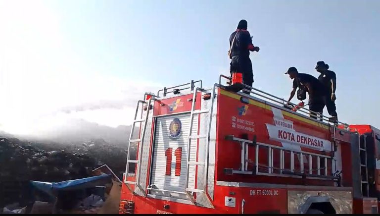 FORUMKEAILANBali.com – Dinas Pemadam Kebakaran dan Penyelamatan Kota Denpasar melukan penyemprotan air di kawasan TPA Suwung, Denpasar, Jumat (11/10).