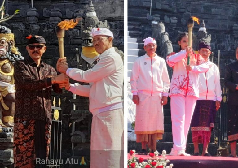 Kirab api obor Porprov Bali di Pura Pasar Agung Kintamani, Minggu (7/9/2025), dilepas Asisten III Bidang Administrasi Umum Sekda Provinsi Bali, Wayan Serinah, bersama Wakil Bupati Bangli Wayan Diar, Ketua KONI Bali I Gusti Ngurah Oka Darmawan, Ketua KONI Kabupaten/Kota di Bali, Anggota DPRD Bali Wauyan Gunawan serta serta undangan terkait lainnya.