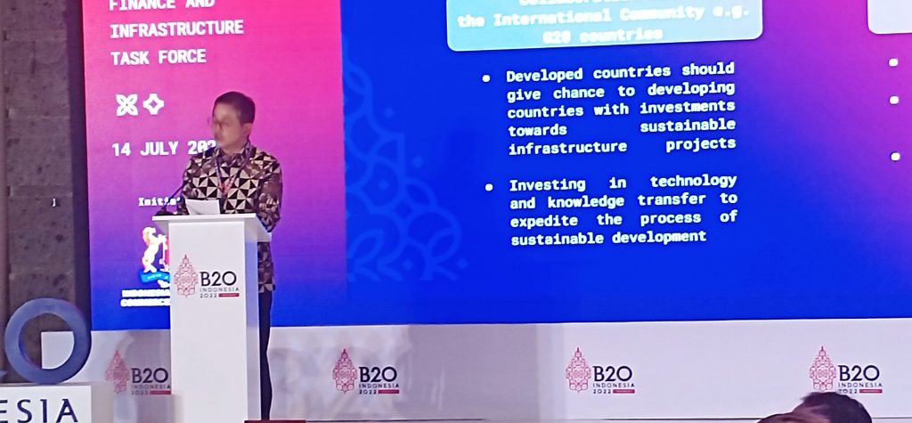 Sementara B20 Finance and Infrastructure Task Force Chair dan CEO of Indonesia Investment Authority (INA) Ridha D.M. Wirakusumah menyatakan, sudah saatnya investasi di bidang infrastruktur membutuhkan jaringan global. Ia mencontohkan, Indonesia pernah membangun 2.000 kilometer jalan tol selama beberapa tahun terakhir. Pembangunan ini membutuhkan pengorbanan besar dan biaya yang tinggi. Infrastruktur ini sangat penting bagi masyarakat memberikan banyak benefit bagi masyarakat. ”Perlu kerjasama global baik pemerintah Indonesia, perbankan, sektor swasta juga jaringan seluruh dunia. Sebab banyak dana-dana yang bisa dikumpulkan dari luar negeri atau dalam negeri yang bisa dipertanggungjawabkan secara baik,” ujarnya.