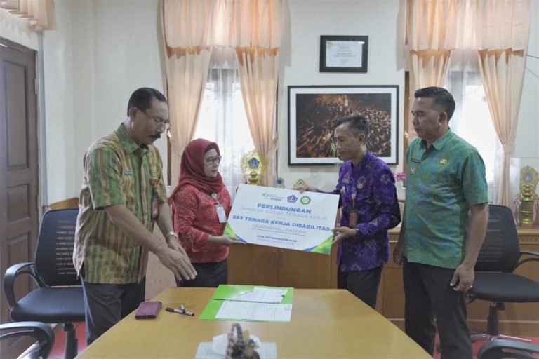 FORUM Keadilan Bali – Kepala Dinas Perindustrian dan Tenaga Kerja Badung I Putu Eka Merthawan mendampingi Kepala Kantor BPJS Ketenagakerjaan Cabang Badung Nurul Indahyati menyerahkan secara simbolis kartu BPJS Ketenagakerjaan kepada 583 tenaga kerja disabilitas di Kecamatan Abiansemal, Badung di Ruang Rapat Camat Abiansemal, Selasa (15/11).