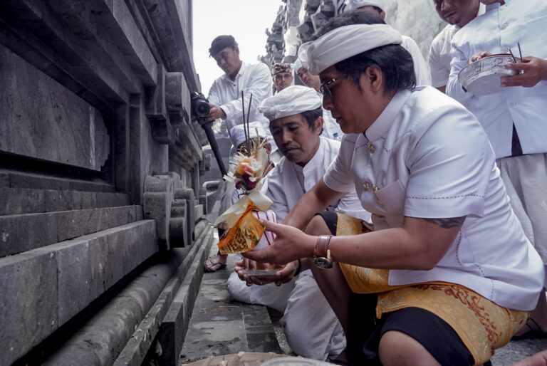 FORUM Keadilan Bali – Bupati Badung I Nyoman Giri Prasta bersama Nyonya Seniasih Giri Prasta menghadiri upacara melaspas dan mendem pedagingan di Pura Desa, Desa Adat Sekarmukti, Banjar Sekarmukti, Desa Belok/Sidan, Kecamatan Petang, Jumat (6/1).