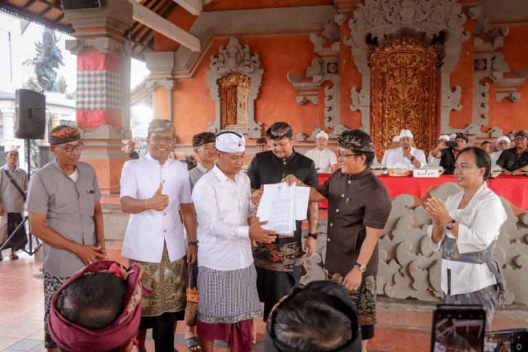 FORUM Keadilan Bali – Bupati Badung I Nyoman Giri Prasta menyerahkan Surat Keputusan (SK) Hibah, Naskah Perjanjian Hibah Daerah (NPHD), Berita Acara Serah Terima (BAST), Hibah Tanah Milik Pemkab Badung seluas 2,7 are kepada Banjar Dirgahayu, Gerih.