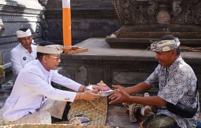 FORUMKEADILANBali.com – Bupati Klungkung I Made Satria menghadiri rangkaian Upacara Karya Mamungkah, Caru Balik Sumpah, Ngenteg Linggih, Nyenuk Mekebat Daun lan Mangun Ayu Puta Melanting Desa Adat Sari Merta, Desa Negari, Kecamatan Banjarangkan Kabupaten Klungkung, Rabu (13/8/2025).