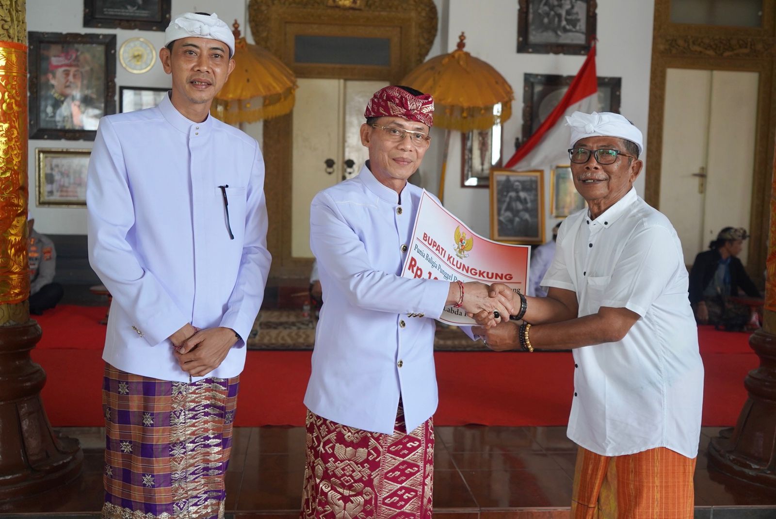 Dalam kesempatan tersebut, Bupati Satria menyerahkan punia sebesar Rp100 juta diterima Cokorda Gde Agung. (fkb/pas)