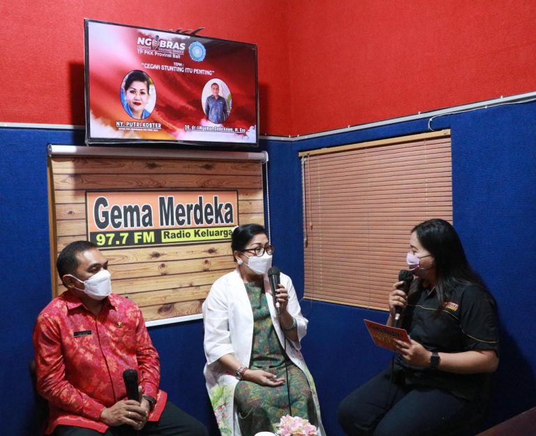 FORUM Keadilan Bali – Ketua TP PKK Provinsi Bali Ny. Putri Suastini Koster didampingi Kepala Dinas Kesehatan Provinsi Bali I Nyoman Gede Anom menjadi narasumber dalam acara Ngobras di Radio Gema Merdeka dengan tema ”Cegah Stunting itu Penting”, Senin ( 25/7).