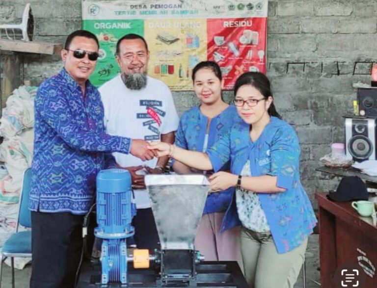 FORUM Keadilan bali – Desa Pemogan, Denpassr Selatan menerima bantuan mesin pencacah plastik dari IDB Bali diterima Perbekel Desa Pemogan, I Made Suwirya di Kantor Perbekel Desa Pemogan, Sabtu (30/9).
