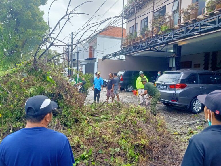 FORUM Keadilan Bali – Tim Respon Cepat Desa Sumerta Kelod, Denpasar Timur menangani pohon tumbang di Jalan Dewi Madri, Jumat (7/7).