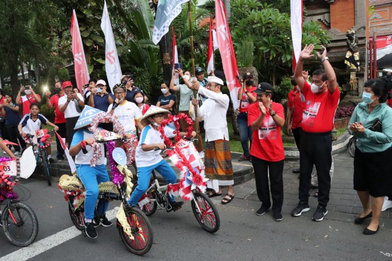 FORUM Keadilan Bali – Puluhan sepeda hias dari kreativitas siswa SD dan SMP di Kota Denpasar memeriahkan peringatan HUT ke-77 RI tahun 2022 dan peringatan HUT Provinsi Bali dilepas Wali Kota Denpasar, I Gusti Ngurah Jaya Negara ditandai pengibasan bendera start, Sabtu (13/8) di depan Kantor Wali Kota Denpasar.