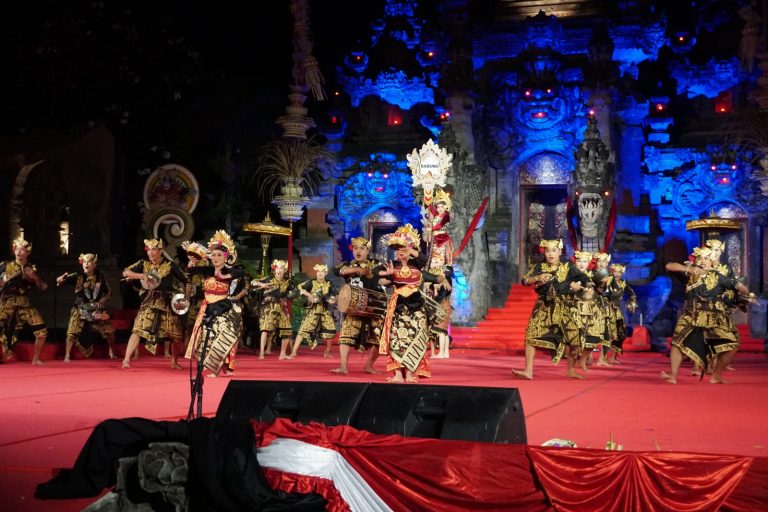 FORUMKeadilanbali.com – Seka Gong Dewa Ayu Jimbaran, Desa Adat Jimbaran Kuta Selatan sebagai duta Kabupaten Badung tampil di Wimbakara Wimbikarena pada Pesta Kesenian Bali (PKB) XLVI, di Panggung Terbuka Ardha Candra, Art Centre Denpasar, Jumat (21/6).