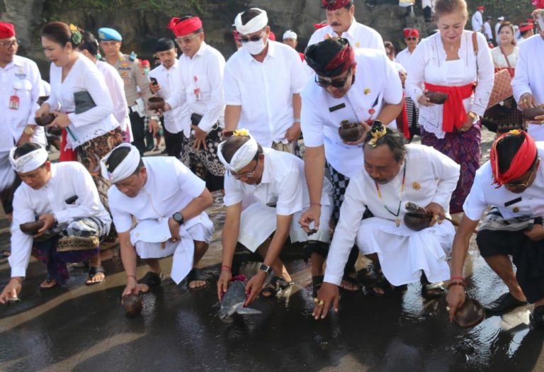 FORUM Keadilan Bali – Gubernur Bali Wayan Koster merayakan Rahina Tumpek Uye dengan Upacara Sagara Kerthi di Pura Batur Ancang, Desa Adat Yeh Gangga, Desa Sudimara, Kecamatan Tabanan, Kabupaten Tabanan dipuput Ratu Shri Bhagawan Putra Nata Nawawangsa Pemayun, sabtu (27/8).