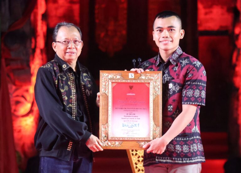 FORUM Keadilan Bali – Gubernur Bali Wayan Koster menyerahkan penghargaan Bali Jani Nugraha dan penghargaan Dharma Kusuma pada acara penutupan Festival Seni Bali Jani (FSBJ) V tahun 2023 di Panggung Terbuka Ardha Candra, Taman Budaya Provinsi Bali, Minggu (30/7).