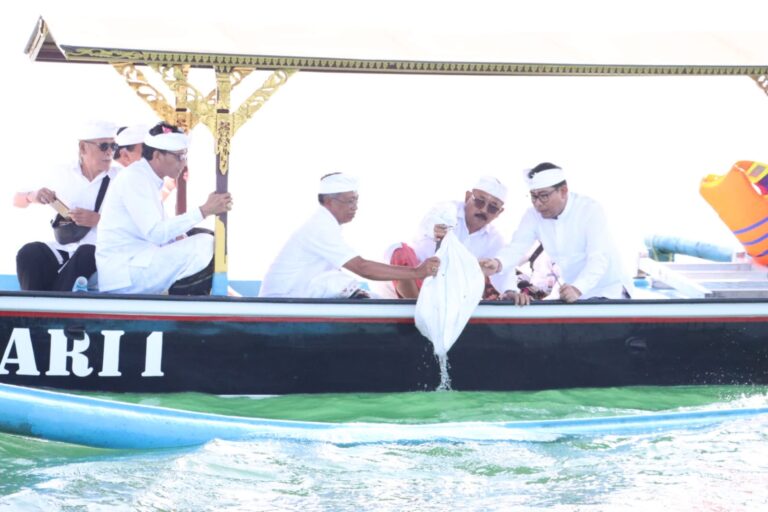 FORUM Keadilan Bali – Serangkaian HUT ke-26 Perusahaan Daerah Air Minum Tirta Sewakadarma Denpasar menggelar prosesi upacara pakelem di Pantai Mertasari Sanur, Rabu (31/5).