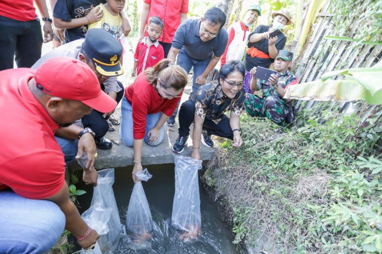 FORUM Keadilan Bali – Bupati Badung Nyoman Giri Prasta ikut menebar benih ikan yang diselenggarakan Seka Teruna Putra Yudha bersinergi dengan Polsek Mengwi menyambut HUT ke-77 Kemerdekaan RI, di Saluran Irigasi Subak Yeh Bolo Perang Lukluk, Mengwi, Minggu (21/8).
