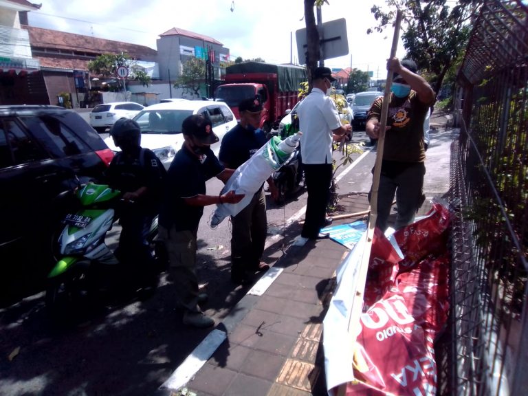 FORUM Keadilan Bali – Guna menjaga estetika Kota Denpasar, Tim Ketertiban Kecamatan Denpasar Barat menertibkan belasan spanduk liar tanpa izin yang dipasang sembarangan di ruas jalan protocol, Rabu (24/8).