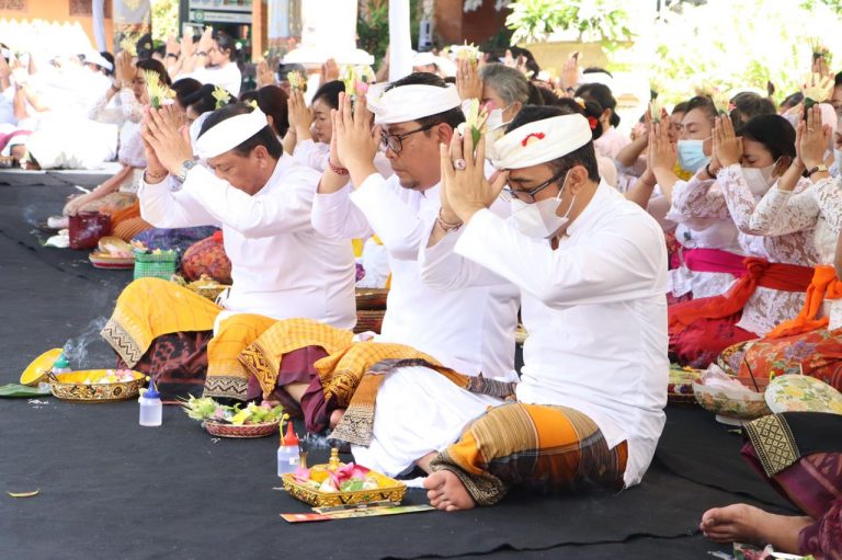 FORUM Keadilan Bali – Ratusan Aparatur Sipil Negara (ASN) di lingkungan Pemkot Denpasar melaksanakan persembahyangan bersama di Pura Praja Natha Kantor Walikota Denpasar. Persembahyangan bersama ini serangkaian piodalan di pura tersebut yang jatuh pada Purnama Sasih Karo Sukra, Kliwon Wuku Medangkungan, Jumat (12/8).