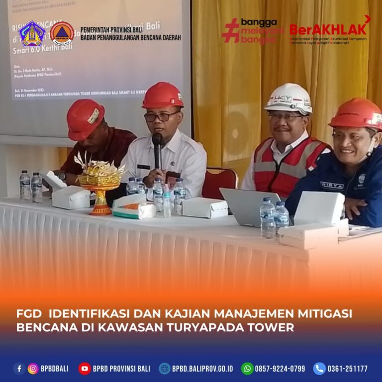 FORUM Keadilan Bali – Kepala Pelaksana Badan Penanggulangan Bencana Daerah (Kalaksa BPBD) Provinsi Bali I Made Rentin menjadi narasumber FGD terkait identifikasi dan kajian manajemen mitigasi bencana pembangunan kawasan Turyapada Tower Komunikasi Bali Smart 6.0 Kerthi Bali di Tower Turyapada, Rabu (22/11).