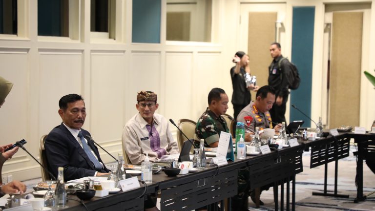 Rapat koordinasi dipimpin Menko Marves RI, Luhut Binsar Pandjaitan didampingi Menteri Menparekraf RI, Panglima TNI Jenderal TNI Agus Subiyanto dan Pj. Gubernur Bali Sang Made Mahendra Jaya.