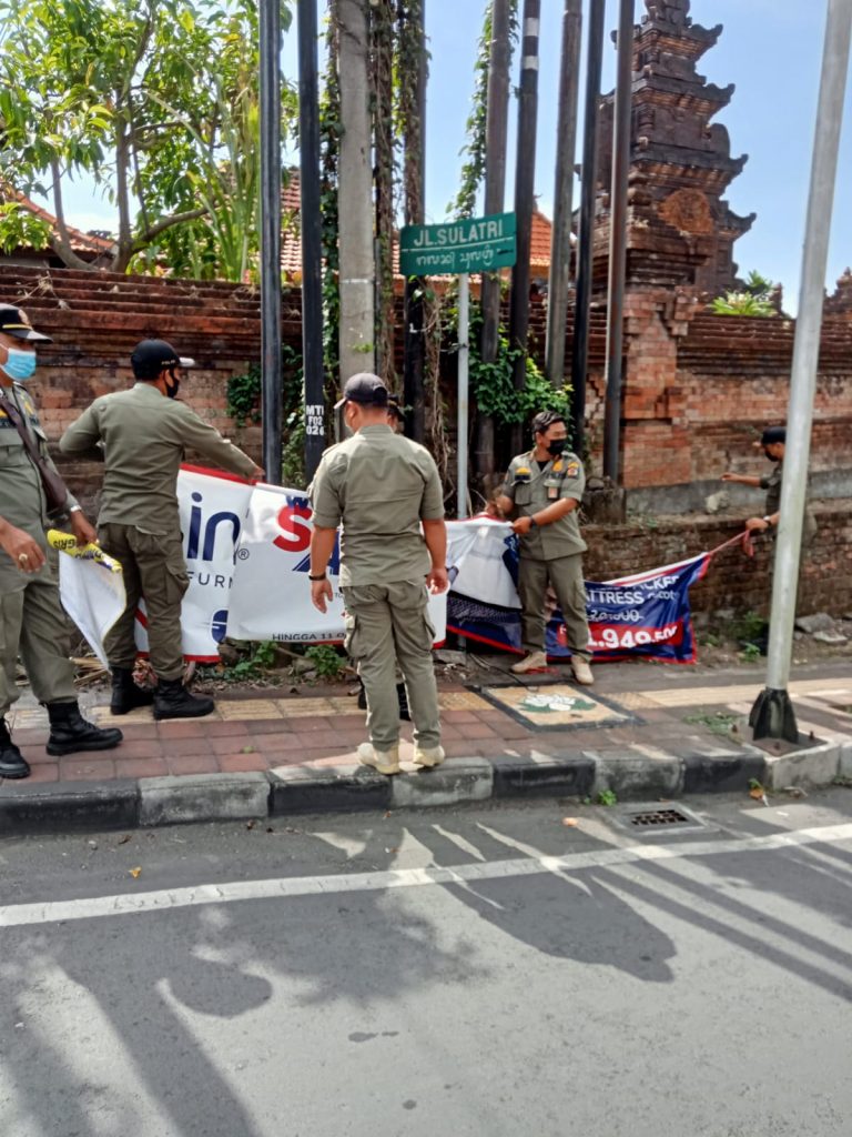 FORUM Keadilan Bali – Kecamatan Denpasar Timur bersama Satuan Polisi Pamong Praja (Satpol PP) Kota Denpasar memberangus belasan baliho, spanduk, dan umbul-umbul sudah kedaluwarsa, Senin (19/9).
