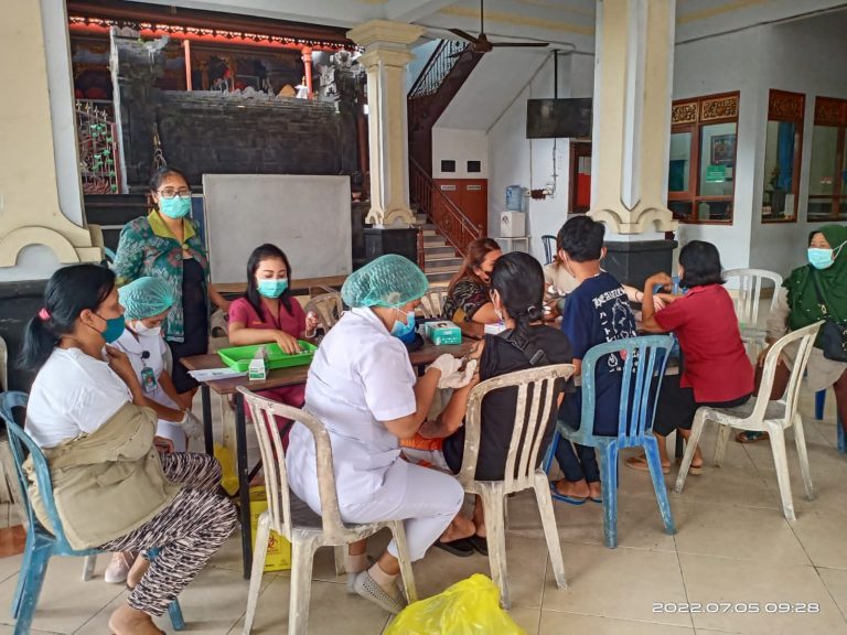 FORUM Keadilan Bali – Mempercepat cakupan vaksin dosis ketiga atau bosterr, Pemerintah Kota (Pemkot) Denpasar melalui Kelurahan Sesetan, Denpasar Selatan memvaksinasi boster 122 warga, di wantilan Balai Banjar Tengah Sesetan, Selasa (5/7).