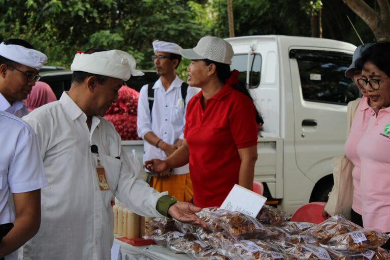 FORUM Keadilan Bali – Guna mengendalikan harga bahan pangan pokok menjelang Hari Raya Idul Fitri 1444 H, Pemkot Denpasar melalui Dinas Perikanan dan Ketahanan Pangan Kota Denpasar bekerja sama dengan Takmir Masjid Al-Hikmah Desa Kesiman Kertalangu menggelar bazar pangan ditinjau Asisten II Kota Denpasar, AA Gde Risnawan, Rabu (5/4).