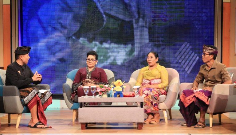 FORUM Keadilan Bali – Ketua Dewan Kerajinan Nasional Daerah (Dekranasda) Provinsi Bali Ny. Putri Suastini Koster menjadi pembicara pada acara ”Apa Kabar UMKM Bali” (AKU Bali) disiarkan dari studio TVRI Bali, Kamis (15/9). Talkshow mengusung tema ”Melestarikan Warisan Tenun Songket Bali” menghadirkan perajin tenun Ni Wayan Astini dan Ketut Darmawan.
