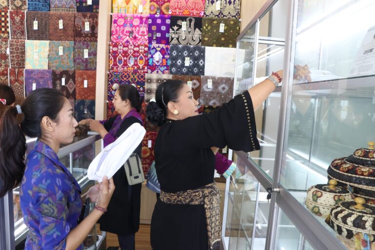 FORUM Keadilan Bali – Ketua Dekranasda Provinsi Bali Ny. Putri Koster memastikan stand Dekranasda di kawasan Suci Besakih tertata dengan baik. Turun tangan langsung meninjau dan menata langsung stand yang berada di area Manik Mas, Rabu (14/6).