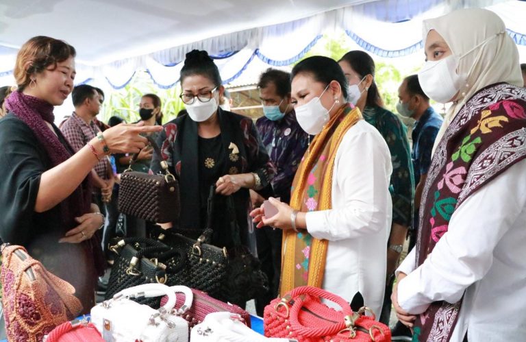 FORUM Keadilan Bali – Ketua Dewan Kerajinan Nasional Daerah (Dekranasda) Provinsi Bali Ny. Putri Suastini Koster mendampingi istri Menteri Perhubungan RI Ny. Endang Budi Karya Sumadi mengunjungi kerajian tenun di Kabupaten Jembrana, Jumat (7/102).