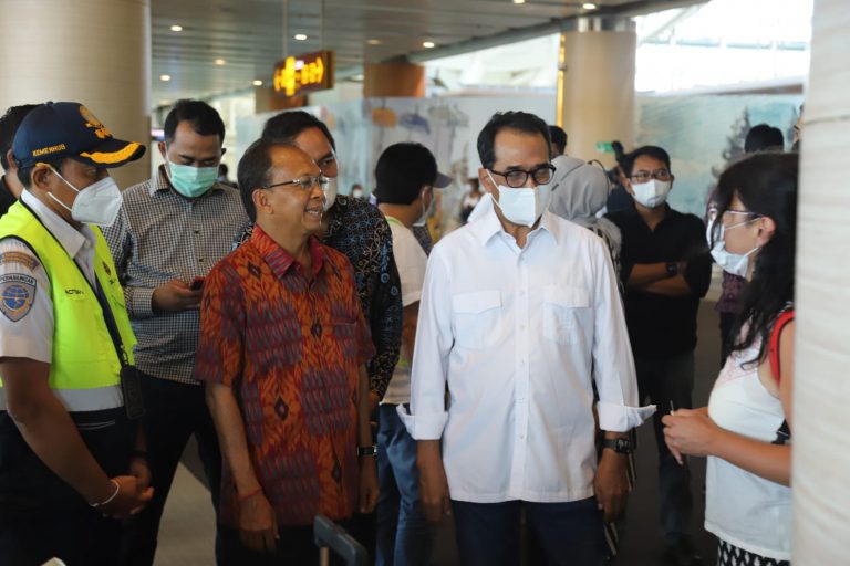 Menteri Perhubungan Republik Indonesia Budi Karya Sumadi dalam agenda kunjungan kerjanya didampingi Gubernur Provinsi Bali I Wayan Koster dan General Manager PT Angkasa Pura I Bandara Internasional I Gusti Ngurah Rai Bali, Handy Heryudhitiawan