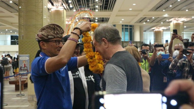 FORUM Keadilan Bali – Menteri Pariwisata dan Ekonomi Kreatif (Menparekraf) Republik Indonesia Sandiaga Uno didampingi Wakil Gubernur Bali Cokorda Artha Ardana Sukawati menyambut kedatangan wisatawan dari Korea sekaligus memberikan kalungan bunga dan cokelat kepada penumpang di tahun 2023.
