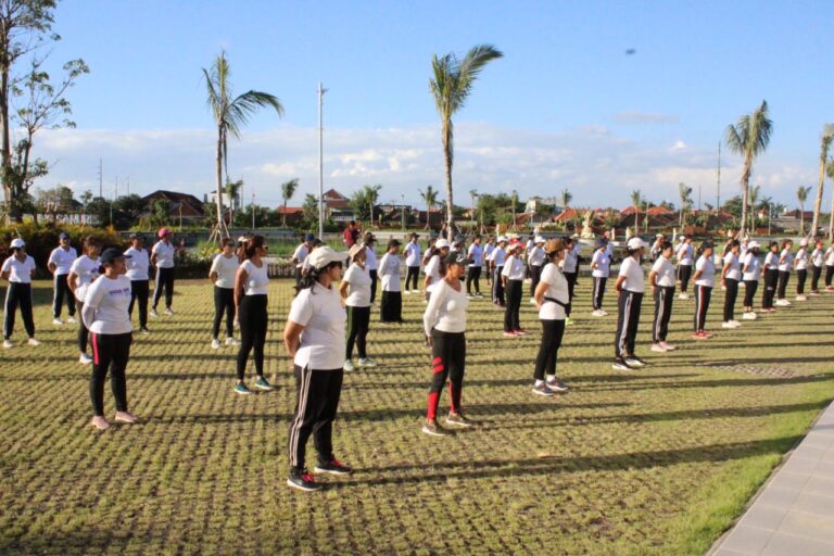 FORUM Keadilan Bali – Ketua TP PKK Kota Denpasar, Ny. Sagung Antari Jaya Negara menghadiri Senam Massal Sicita digelar di Desa Sanur Kauh, Denpasar Selatan, Minggu (12/3).