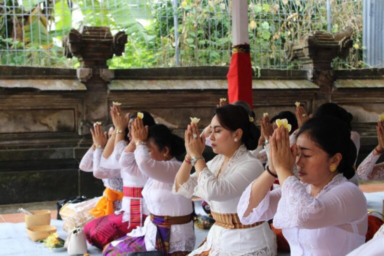 FORUM Keadilan Bali – Ketua TP. PKK Kota Denpasar, Ny. Antari Jaya Negara sembahyang bersama upacara piodalan Gedung Wanita Santi Graha dilangsungkan bertepatan Purnama Sasih Karo, Selasa (1/8).