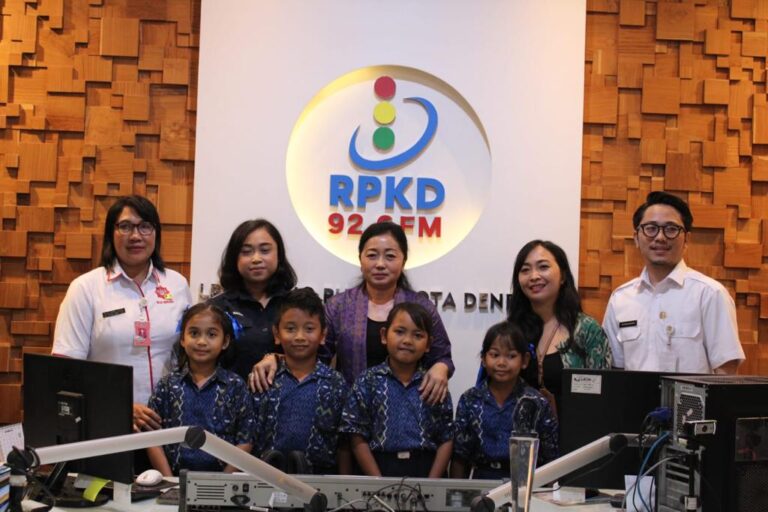 FORUM Keadilan Bali – Bunda Literasi Kota Denpasar Ny. Sagung Antari Jaya Negara kembali mendongeng bahasa Bali (masatua Bali) bersama siswa-siswi SDN 14 Dangin Puri disiarkan di Radio Publik Kota Denpasar (RPKD), Rabu ( 27/9).
