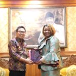 FORUM Keadilan Bali – Ketua TP PKK Kota Denpasar, Ny. Sagung Antari Jaya Negara menyerahkan bantuan buah lokal dari Corporate Social Responsibility (CSR) merupakan fasilitasi Dinas Sosial dari Bali Food Industry di depan Gedung Dharma Negara Alaya, Jumat (28/7).