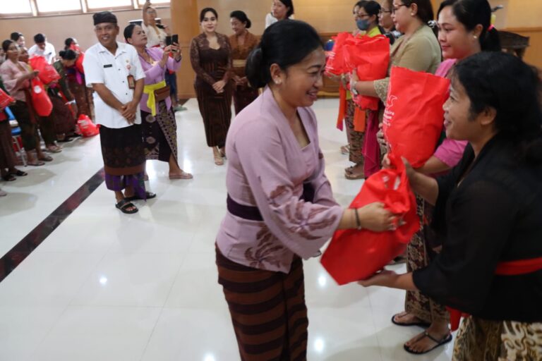 FORUM Keailan Bali – Ketua Tim Penggerak PKK Kota Denpasar, Ny. Sagung Antari Jaya Negara bersama Ketua Gabungan Organisasi Wanita Kota Denpasar, Ny. Ayu Kristi Arya Wibawa, dan Ketua DWP Denpasar, Ny. Ida Ayu Widnyani Wiradana menyerahkan ratusan paket sembako dari Yayasan Bina Ilmu Korea Selatan kepada kader PKK Kecamatan, di Gedung Wanita Shanti Graha Denpasar, Kamis(9/2).