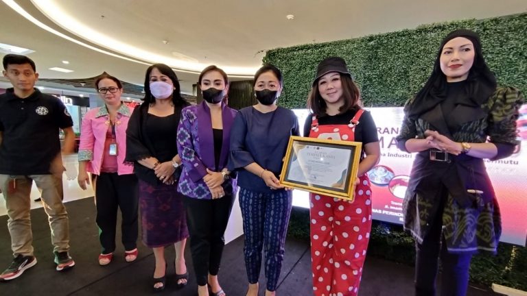 FORUM Keadilan Bali – Ketua Dekranasda Kota Denpasar, Ny. Sagung Antari Jaya Negara menyerahkan hadiah kepada para pemenang lomba peragaan busana casual endek serangkaian pameran bersama Industri dan Perdagangan Bermutu (Gema Tridatu) di Trans Studio Mall Denpasar, Minggu (25/9).