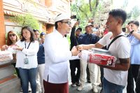Ny. Antari Jaya Negara berinteraksi langsung dengan para siswa. Dari perbincangan, terungkap sebagian anak masih mengalami trauma akibat banjir melanda wilayah mereka.
