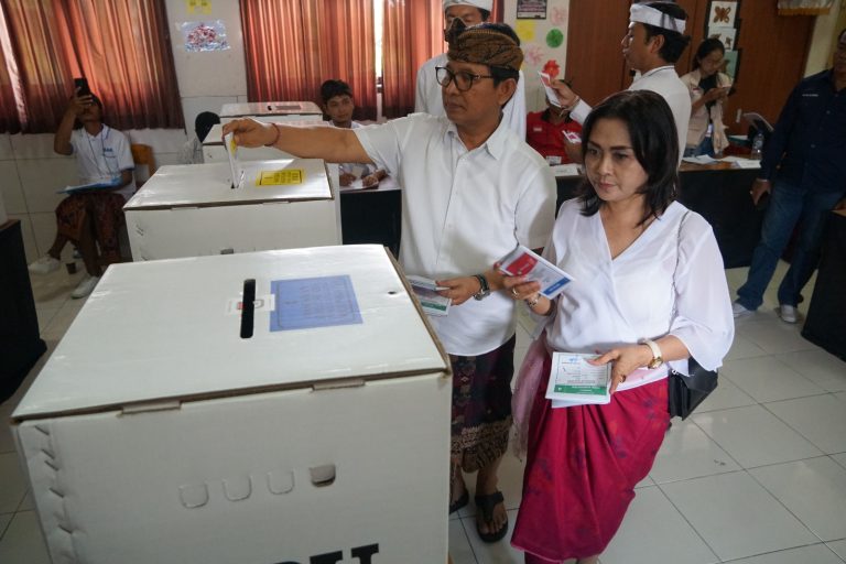 FORUM Keadilan Bali – Sekretaris Daerah (Sekda) Badung Wayan Adi Arnawa menyalurkan hak pilihnya di TPS 009, SD Nomor 4 Pecatu, Desa Pecatu, Kuta Selatan, Badung, Rabu (14/2).