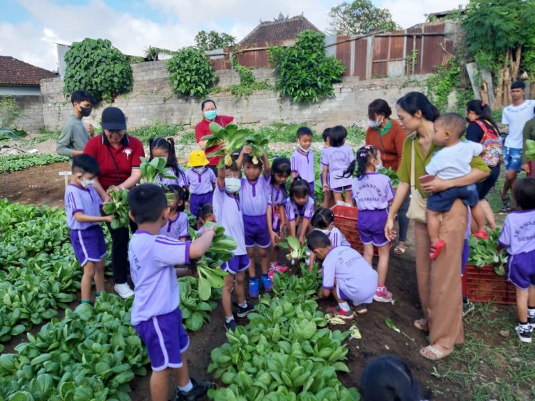 FORUM Keadilan Bali – Puluhan orang siswa TK Swastika Desa Dauh Puri Kaja belajar edukasi sayuran pada Program Padat Karya Tunai (PKT) Ketahanan Pangan Nabati dan Hewani Desa Dauh Puri
