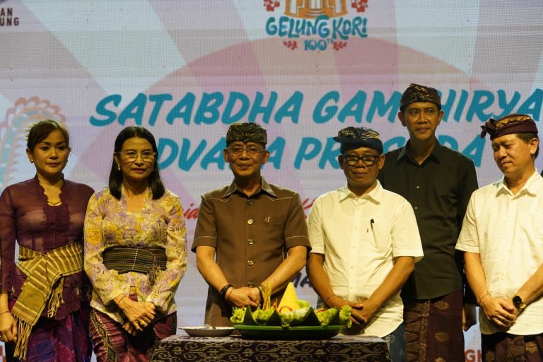 KLUNGKUNG, FORUMKEADILANBali.com - Bupati Klungkung, I Made Satria bersama Ketua TP PKK Kabupaten Klungkung Ny. Eva Satria dan Wakil Bupati Klungkung Tjokorda Gde Surya Putra menghadiri peringatan Satu Abad Gelung