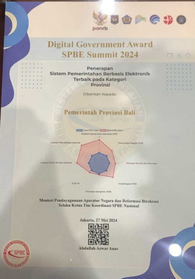 FORUMKeadilanbali.com – Pemerintah Provinsi (Pemprov) Bali berhasil menyabet penghargaan Digital Government Award SPBE Summit 2024 dalam Penerapan Sistem Pemerintahan Berbasis Elektronik Terbaik Kategori Provinsi diserahkan Presiden Republik Indonesia Joko Widodo diterima Penjabat Gubernur Bali S.M Mahendra Jaya pada acara SPBE Summit 2024 dan Peluncuran Govtech Indonesia di Istana Negara, Senin (27/5).