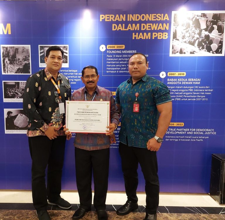 Penghargaan kepada Kabupaten Badung sebagai Kabupaten Peduli HAM diberikan secara simbolis Menteri Hukum dan HAM RI dan diserahkan Dirjen Hukum dan HAM diterima Asisten Pemerintahan dan Kesra I Nyoman Sujendra didampingi Kabag Hukum AA Gde Asteya Yudhya dan Pengelola Pelayanan Hukum pada Bagian Hukum Ketut Gede Mardika.