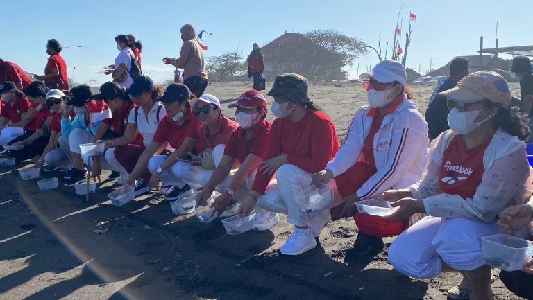 FORUM Keadilan Bali – Memperingati HUT ke-77 Kemerdekaan RI, TP PKK Kota Denpasar dan Dharma Wanita Persatuan (DWP) Kota Denpasar melepas 150 ekor tukik jenis lekang di Pantai Biaung, Denpasar Timur, Rabu (16/8).