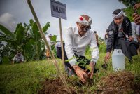Penanaman pohon kelapa genjah diawali persembahyangan bersama di Pura Puseh Besan, dilanjutkan penyerahan secara simbolis bibit pohon kepada krama subak setempat.